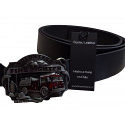 Cinturón negro de cuero de suela, 4 cm. de ancho hecho a mano en chile, con hebilla de metal de aleación de zinc diseño de bombero.
